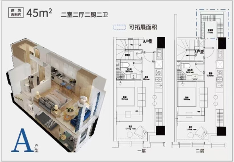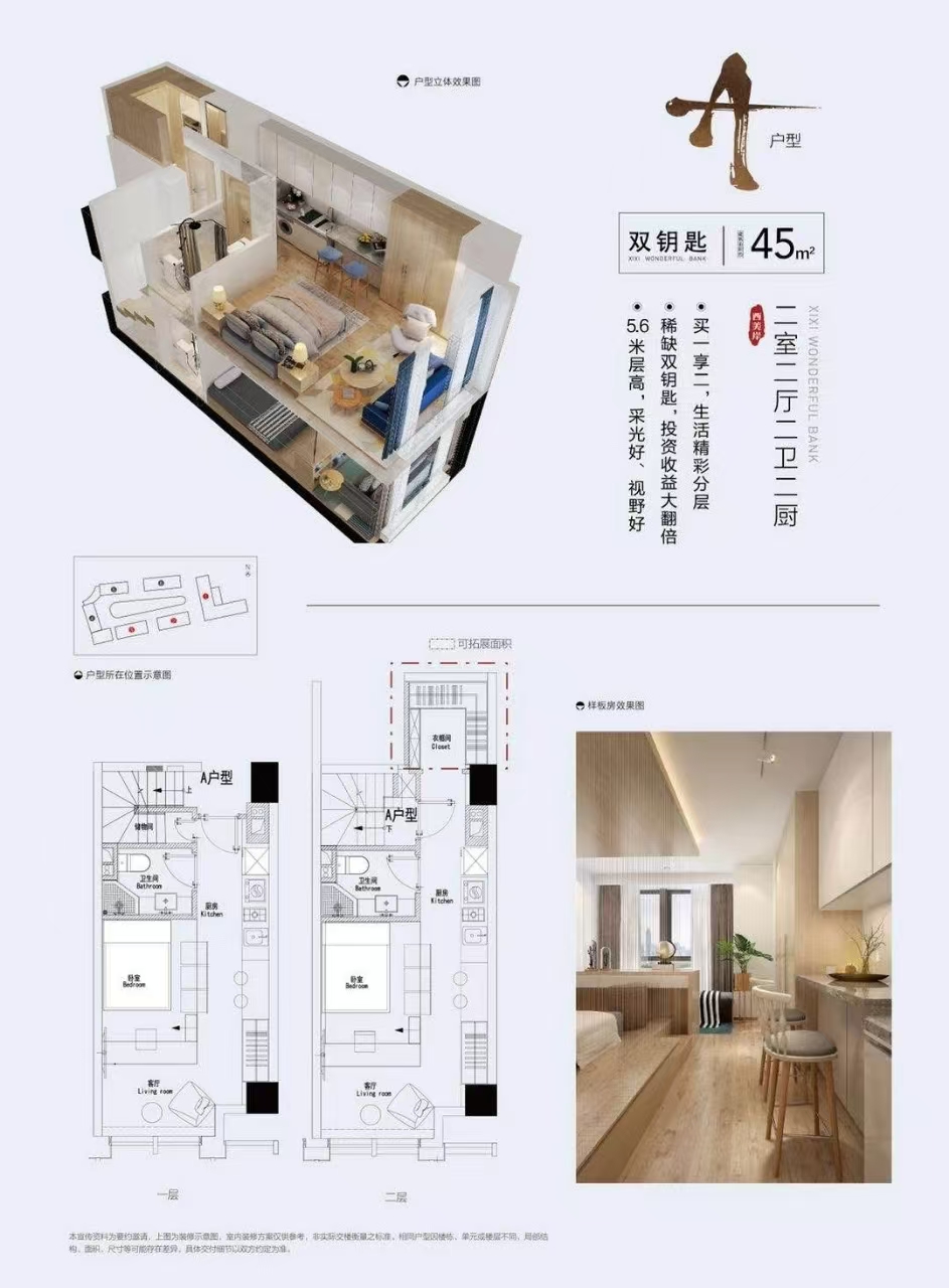 双钥匙公寓 45㎡ 约120万(26800元/m²)